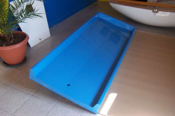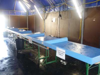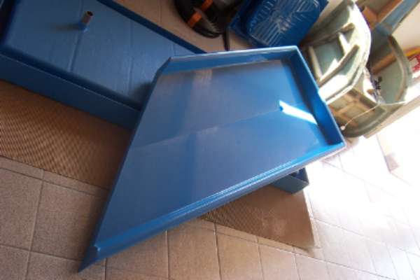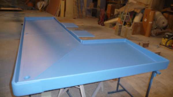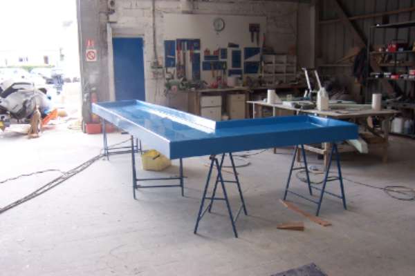 Banc en L avec coupe d'angle. Deux tablettes de vente ou support balance sont fixées au banc